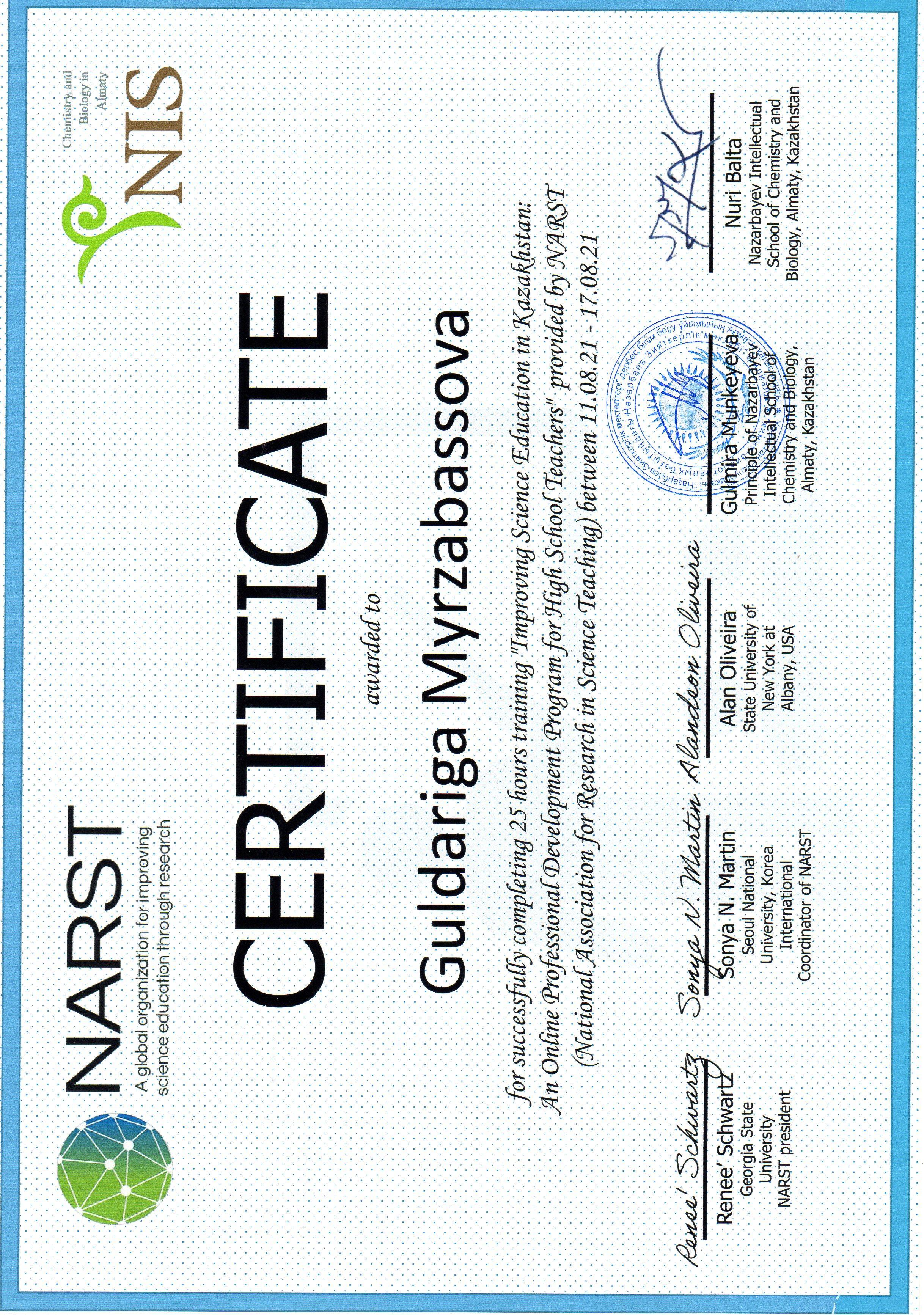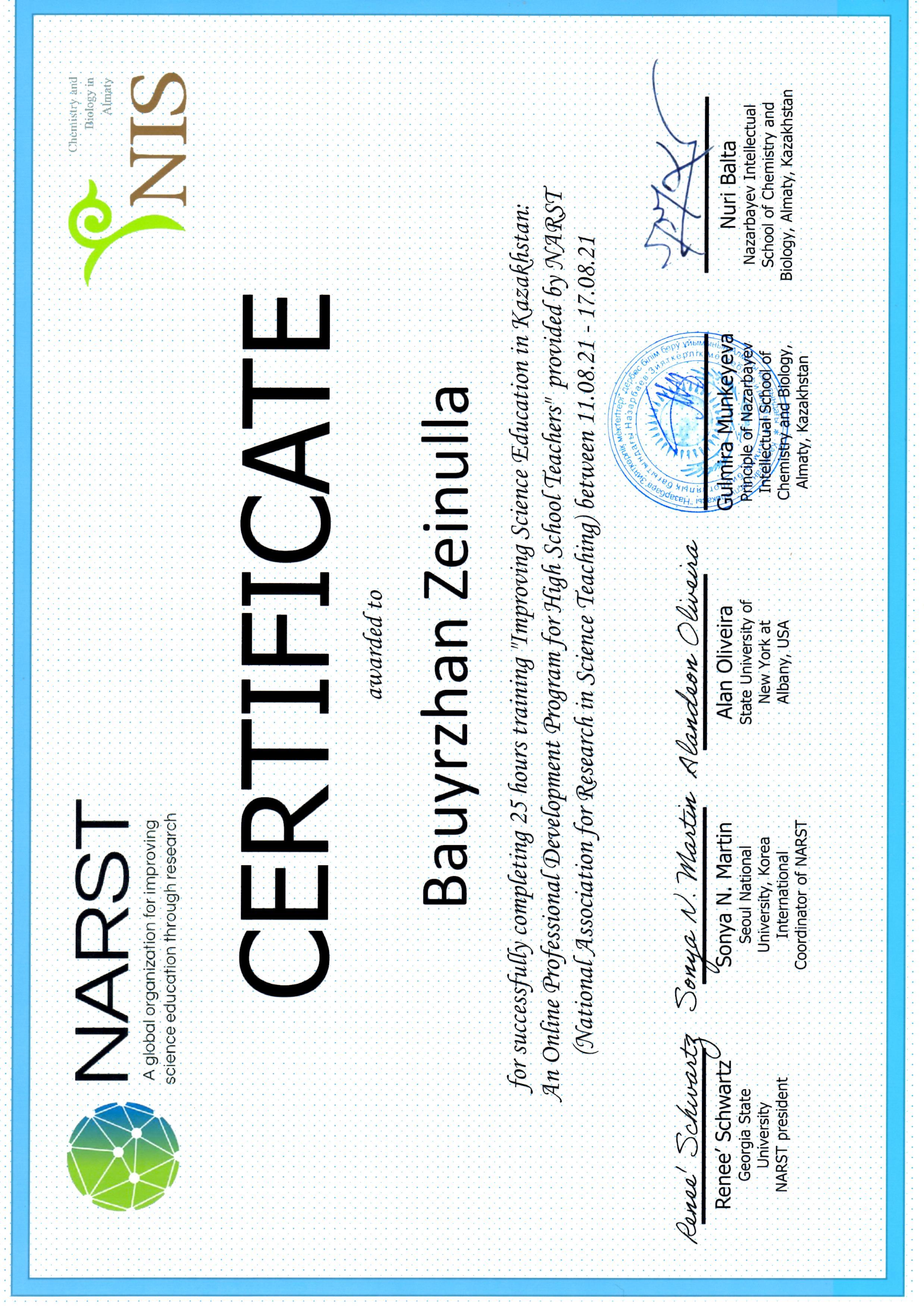 Құттықтаймыз! Біздің Бауыржан Зейнулла ағайымыз бен Гүлдариға Мырзабасова апайымыз NARST - "Дүниежүзілік Жаратылыстану Ғылымдарының Оқытуын Жақсарту" ұйымының ұйымдастыруымен өткен 25 сағаттық оқыту тренингін өтіп, оқу сапасына өз үлестерін қосты!